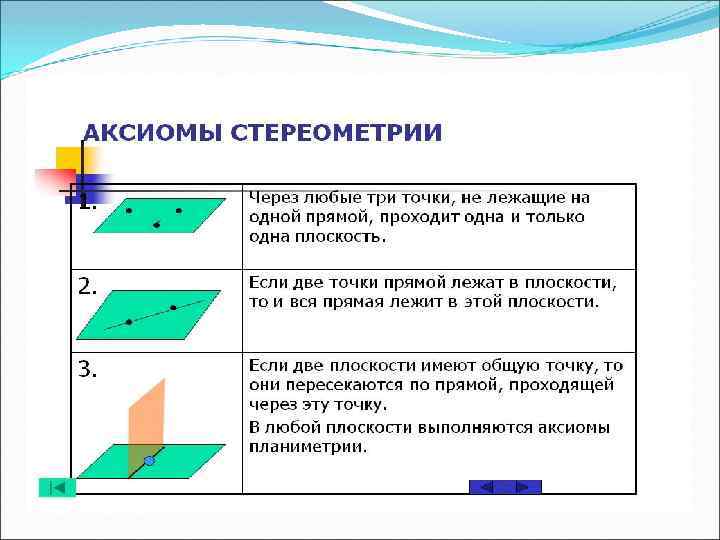 Аксиома Какова бы ни была плоскость, существуют точки в пространстве, принадлежащие этой плоскости, и точки, не принадлежащие ей. Если две разные плоскости имеют общую точку, то они имеют и общую прямую, проходящую через эту точку. Если две разные прямые имеют общую точку, то через них можно провести плоскость, и притом единственную. Для произвольной плоскости выполняются аксиомы планиметрии.
