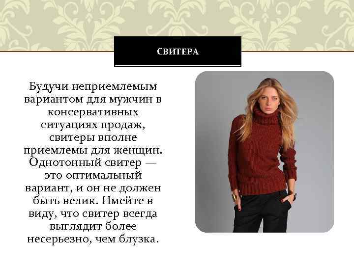 СВИТЕРА Будучи неприемлемым вариантом для мужчин в консервативных ситуациях продаж, свитеры вполне приемлемы для женщин. Однотонный свитер — это оптимальный вариант, и он не должен быть велик. Имейте в виду, что свитер всегда выглядит более несерьезно, чем блузка.