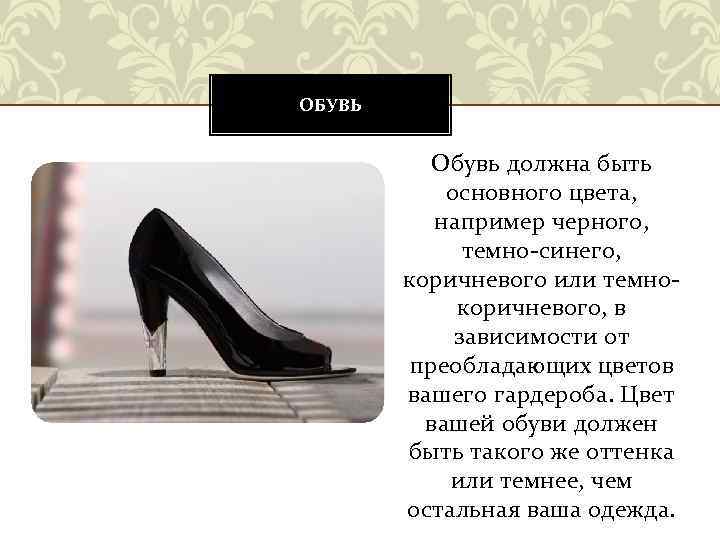 ОБУВЬ Обувь должна быть основного цвета, например черного, темно-синего, коричневого или темнокоричневого, в зависимости от преобладающих цветов вашего гардероба. Цвет вашей обуви должен быть такого же оттенка или темнее, чем остальная ваша одежда.