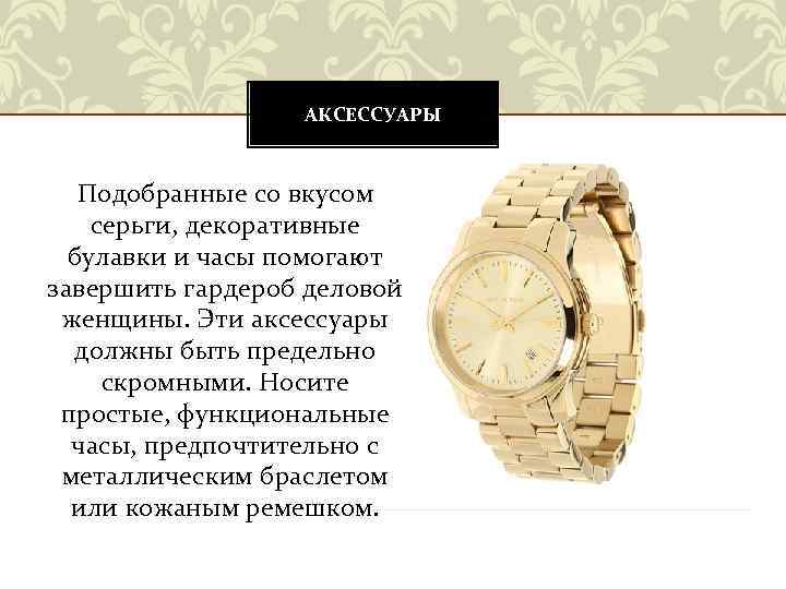 АКСЕССУАРЫ Подобранные со вкусом серьги, декоративные булавки и часы помогают завершить гардероб деловой женщины. Эти аксессуары должны быть предельно скромными. Носите простые, функциональные часы, предпочтительно с металлическим браслетом или кожаным ремешком.