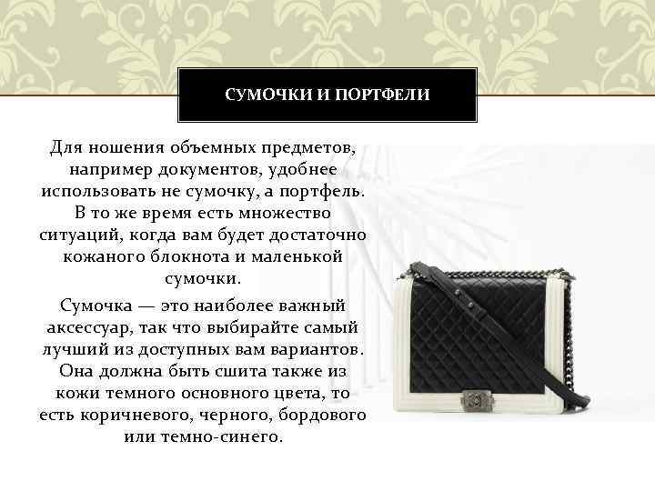 СУМОЧКИ И ПОРТФЕЛИ Для ношения объемных предметов, например документов, удобнее использовать не сумочку, а портфель. В то же время есть множество ситуаций, когда вам будет достаточно кожаного блокнота и маленькой сумочки. Сумочка — это наиболее важный аксессуар, так что выбирайте самый лучший из доступных вам вариантов. Она должна быть сшита также из кожи темного основного цвета, то есть коричневого, черного, бордового или темно-синего.