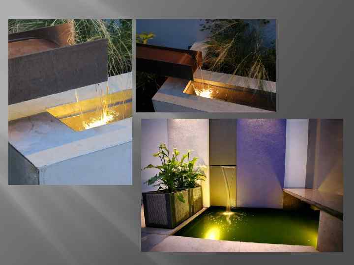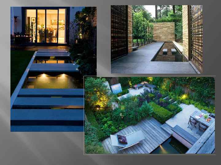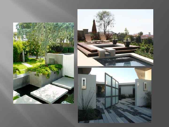 Основные черты Дизайн удобный для жизни, легкий в уходе и гармоничный внешне тандем современных динамичных форм, необычных конструкций и аксессуаров применение современных материалов: стекла, зеркала, металла и прочих композитных материалов, хорошо обработанное дерево, как правило, с выявлением его текстуры. ландшафтного освещения таких садов могут быть использованы новаторские идеи и самые невероятные светильники В планировке предпочтение отдается динамичным формам (садовые дорожки преимущественно прямые, но могут быть расположены зигзагообразно, по диагонали, либо же, закольцованы по правильной окружности) Для мощения используются довольно крупные плиты. Весьма эффектно смотрится сочетание дерева с металлом. Для этого стиля предпочтительны необычные искусственные водоемы, оформленные металлом и бетоном. Ограждения могут выполнятся из весьма нетрадиционных материалов – профнастила, сетки, труб и прочего Из малых архитектурных форм наиболее востребованными являются современные Для озеленения подбираются деревья и кустарники с интересной формой кроны и фактурой листвы. скульптуры и всевозможные металлические контейнеры для растений.