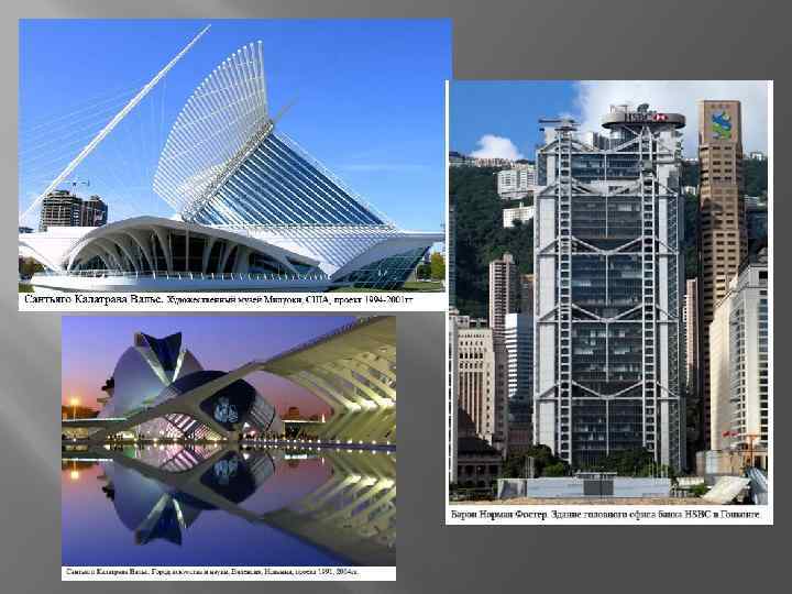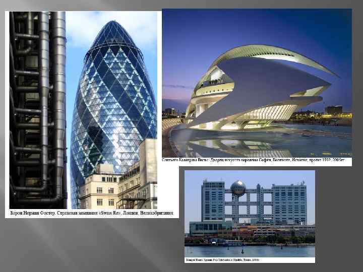 Хай-Тек в Архитектуре зародившийся в недрах позднего модернизма в 1970 -х и нашедший широкое применение в 1980 -х. Главные теоретики и практики хайтека в основном англичане — Норман Фостер, Ричард Роджерс, Николас Гримшоу, на каком-то этапе своего творчества Джеймс Стирлинг и итальянец Ренцо Пиано.