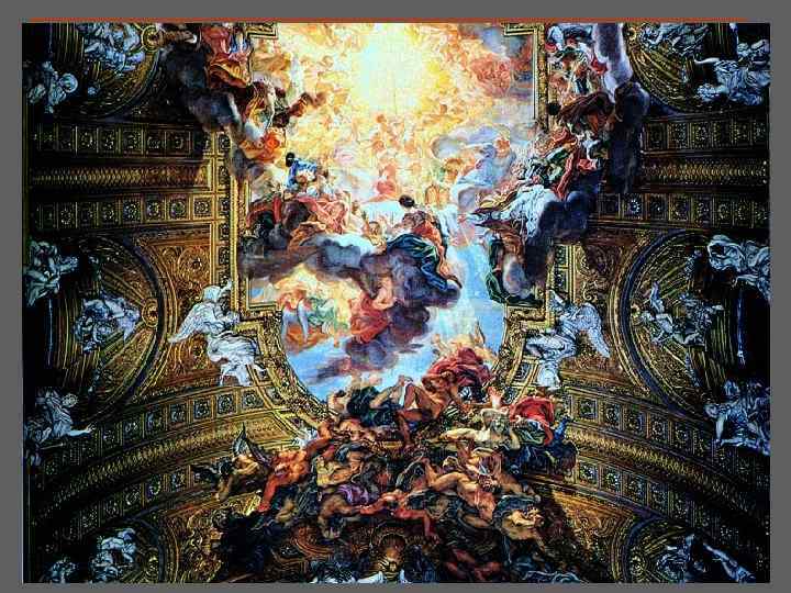 Главная художественная идея Барокко, в сущности, невыполнима: с одной стороны — создание общей иррациональной, мистической атмосферы, а с другой - стремление сделать тайну и чудо осязаемыми, предельно чувственными, материальными, чтобы «можно было руками потрогать» . n n Изображена сцена Страшного Суда, где свет и тень разделяют спасенных и проклятых. Церковный потолок как бы растворяется в небесах, подчеркивая роль церкви — посредника между миром и вечным спасением. ДЖОВАННИ БАТТИСТА ГАУЛИ. Триумф Имени Иисуса,