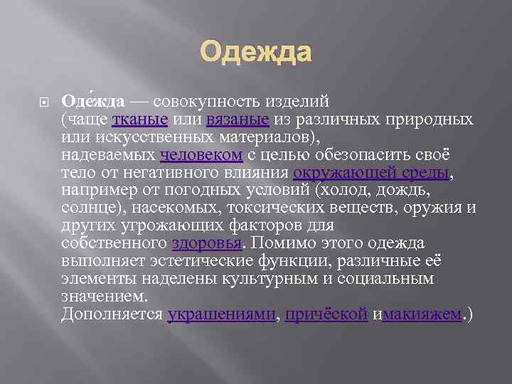 Одежда Оде жда — совокупность изделий (чаще тканые или вязаные из различных природных или искусственных материалов), надеваемых человеком с целью обезопасить своё тело от негативного влияния окружающей среды, например от погодных условий (холод, дождь, солнце), насекомых, токсических веществ, оружия и других угрожающих факторов для собственного здоровья. Помимо этого одежда выполняет эстетические функции, различные её элементы наделены культурным и социальным значением. Дополняется украшениями, причёской имакияжем. )