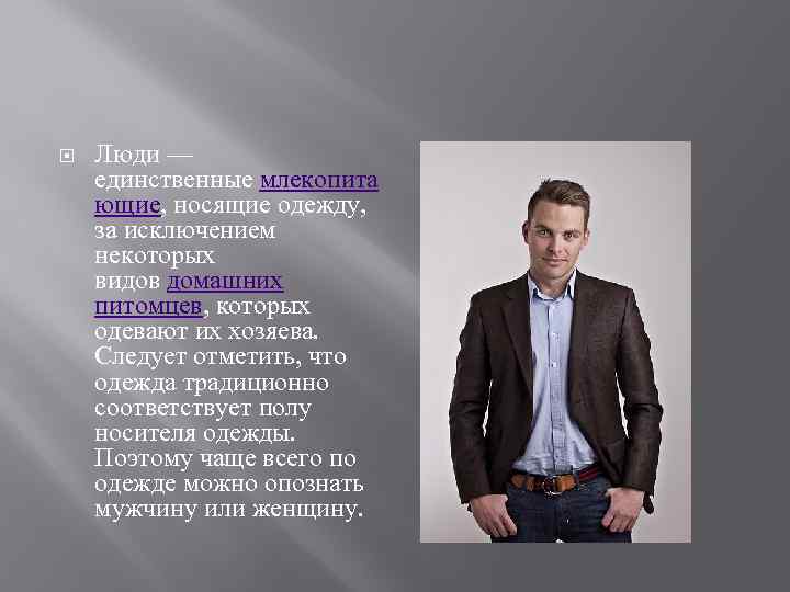 Люди — единственные млекопита ющие, носящие одежду, за исключением некоторых видов домашних питомцев, которых одевают их хозяева. Следует отметить, что одежда традиционно соответствует полу носителя одежды. Поэтому чаще всего по одежде можно опознать мужчину или женщину.