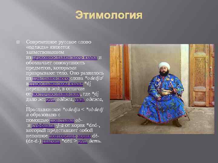 Этимология Современное русское слово «одежда» является заимствованием из церковнославянского языка и обозначает совокупность предметов, которыми прикрывают тело. Оно развилось из праславянского слова *odedja( встарославянском языке *dj перешло в жд, в отличие от восточнославянских, где *dj дало ж: рус. одёжа, укр. оде жа, . Праславянское *odedja < *obdedj a образовано с помощью приставки оb и суффикса -j-a от корня *ded-, который представляет собой неполное повторение корня dě- (de-d-) глагола *děti > рус. деть.