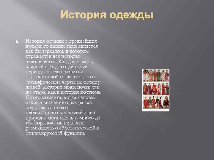 История одежды с древнейших времен до наших дней является как бы зеркалом, в котором отражается вся история человечества. Каждая страна, каждый народ в отдельные периоды своего развития налагают свой отпечаток, свои специфические черты на одежду людей. История моды почти так же стара, как и история костюма. С того момента, когда человек открыл значение одежды как средства защиты от неблагоприятных воздействий природы, оставалось немного до тех пор, пока он не начал размышлять о её эстетической и стилизирующей функции.