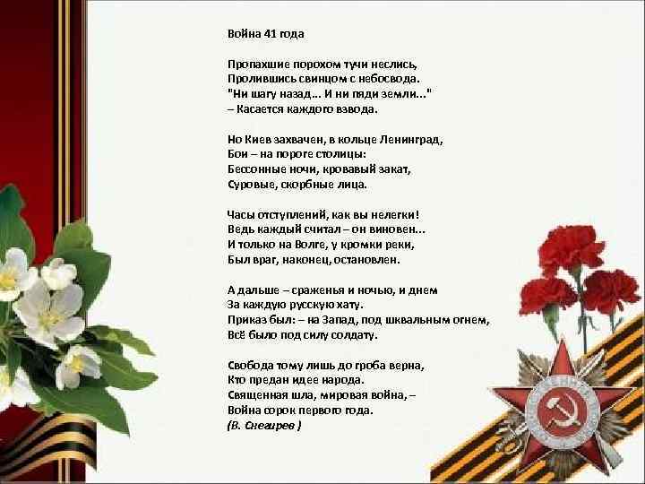Война 41 года Пропахшие порохом тучи неслись, Пролившись свинцом с небосвода. "Ни шагу назад. . . И ни пяди земли. . . " – Касается каждого взвода. Но Киев захвачен, в кольце Ленинград, Бои – на пороге столицы: Бессонные ночи, кровавый закат, Суровые, скорбные лица. Часы отступлений, как вы нелегки! Ведь каждый считал – он виновен. . . И только на Волге, у кромки реки, Был враг, наконец, остановлен. А дальше – сраженья и ночью, и днем За каждую русскую хату. Приказ был: – на Запад, под шквальным огнем, Всё было под силу солдату. Свобода тому лишь до гроба верна, Кто предан идее народа. Священная шла, мировая война, – Война сорок первого года. (В. Снегирев )