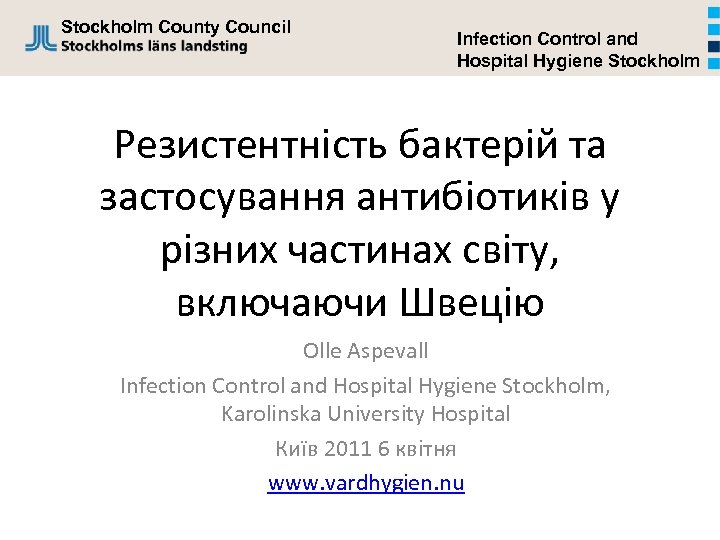 Stockholm County Council Infection Control and Hospital Hygiene Stockholm Резистентність бактерій та застосування антибіотиків у різних частинах світу, включаючи Швецію Olle Aspevall Infection Control and Hospital Hygiene Stockholm, Karolinska University Hospital Київ 2011 6 квітня www. vardhygien. nu