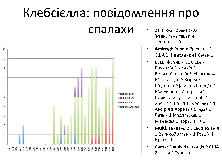 Клебсієлла: повідомлення про спалахи • • • Загалом по лікарнях, інтенсивна терапія, неонатологія Aminogl: Великобританія 2 США 1 Нідерланди 1 Оман 1 ESBL: Франція 11 США 7 Бразилія 6 Іспанія 5 Великобританія 5 Мексика 4 Нідерланди 3 Корея 3 Південна Африка 3 Швеція 2 Німеччина 2 Австралія 2 Польща 2 Туніс 2 Греція 1 Японія 1 Італія 1 Туреччина 1 Австрія 1 Хорватія 1 Індія 1 Латвія 1 Мадагаскар 1 Малайзія 1 Португалія 1 Multi: Тайвань 2 США 1 Іспанія 1 Великобританія 1 Греція 1 Ізраїль 1 Carba: Греція 4 Франція 3 США 2 Італія 2 Туреччина 1
