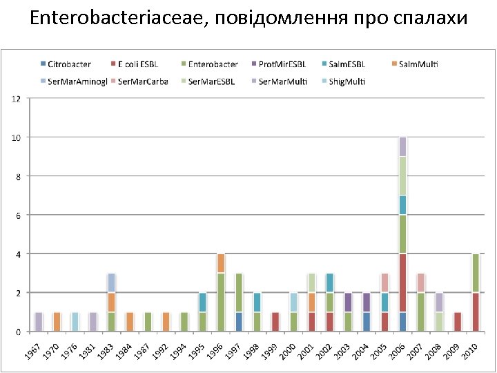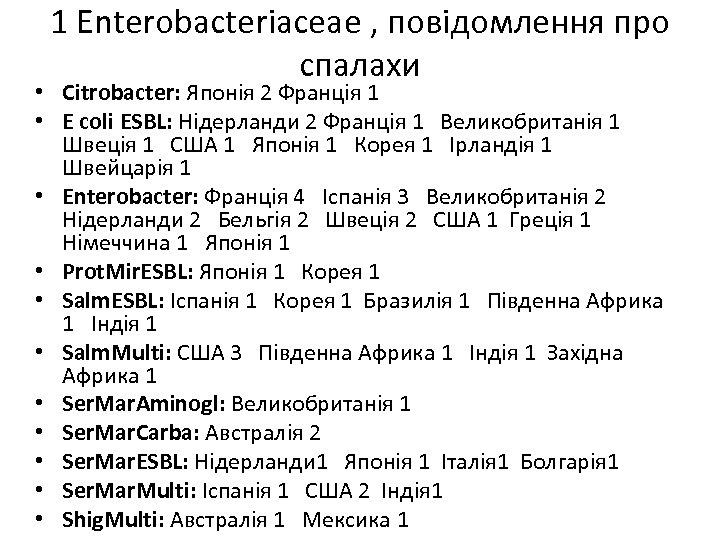 1 Enterobacteriaceae , повідомлення про спалахи • Citrobacter: Японія 2 Франція 1 • E coli ESBL: Нідерланди 2 Франція 1 Великобританія 1 Швеція 1 США 1 Японія 1 Корея 1 Ірландія 1 Швейцарія 1 • Enterobacter: Франція 4 Іспанія 3 Великобританія 2 Нідерланди 2 Бельгія 2 Швеція 2 США 1 Греція 1 Німеччина 1 Японія 1 • Prot. Mir. ESBL: Японія 1 Корея 1 • Salm. ESBL: Іспанія 1 Корея 1 Бразилія 1 Південна Африка 1 Індія 1 • Salm. Multi: США 3 Південна Африка 1 Індія 1 Західна Африка 1 • Ser. Mar. Aminogl: Великобританія 1 • Ser. Mar. Carba: Австралія 2 • Ser. Mar. ESBL: Нідерланди 1 Японія 1 Італія 1 Болгарія 1 • Ser. Mar. Multi: Іспанія 1 США 2 Індія 1 • Shig. Multi: Австралія 1 Мексика 1