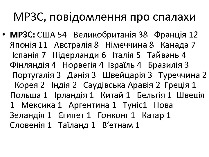 МРЗС, повідомлення про спалахи • МРЗС: США 54 Великобританія 38 Франція 12 Японія 11 Австралія 8 Німеччина 8 Канада 7 Іспанія 7 Нідерланди 6 Італія 5 Тайвань 4 Фінляндія 4 Норвегія 4 Ізраїль 4 Бразилія 3 Португалія 3 Данія 3 Швейцарія 3 Туреччина 2 Корея 2 Індія 2 Саудівська Аравія 2 Греція 1 Польща 1 Ірландія 1 Китай 1 Бельгія 1 Швеція 1 Мексика 1 Аргентина 1 Туніс1 Нова Зеландія 1 Єгипет 1 Гонконг 1 Катар 1 Словенія 1 Таїланд 1 В’етнам 1