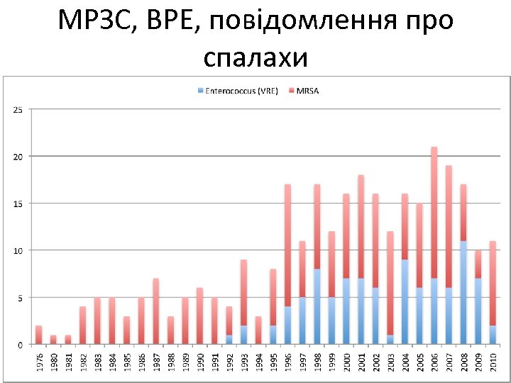 Enterococcus, ВРЕ, повідомлення про спалахи • Enterococcus (ВРЕ): США 22 Канада 7 Австралія 6 Німеччина 6 Великобританія 5 Франція 4 Туреччина 4 Сингапур 4 Іспанія 3 Греція 3 Бразилія 3 Корея 3 Нідерланди 3 Польща 3 Південна Корея 3 Ірландія 3 Японія 2 Колумбія 2 Італія 2 Китай 2 Тайвань1 Бельгія 1 Південна Африка 1 Швеція 1 Угорщина 1 Пакістан 1