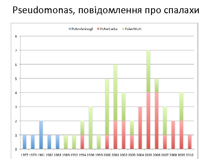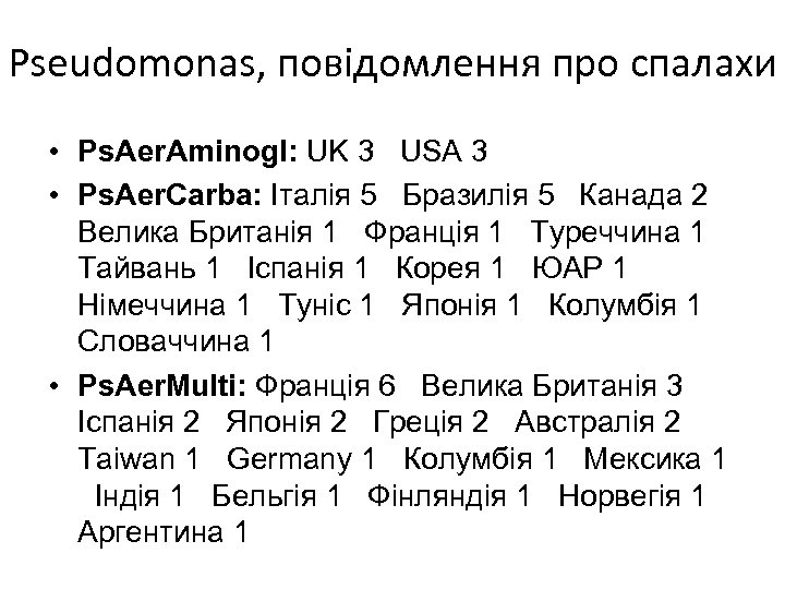 Pseudomonas, повідомлення про спалахи • Ps. Aer. Aminogl: UK 3 USA 3 • Ps. Aer. Carba: Італія 5 Бразилія 5 Канада 2 Велика Британія 1 Франція 1 Туреччина 1 Тайвань 1 Іспанія 1 Корея 1 ЮАР 1 Німеччина 1 Туніс 1 Японія 1 Колумбія 1 Словаччина 1 • Ps. Aer. Multi: Франція 6 Велика Британія 3 Іспанія 2 Японія 2 Греція 2 Австралія 2 Taiwan 1 Germany 1 Колумбія 1 Мексика 1 Індія 1 Бельгія 1 Фінляндія 1 Норвегія 1 Аргентина 1