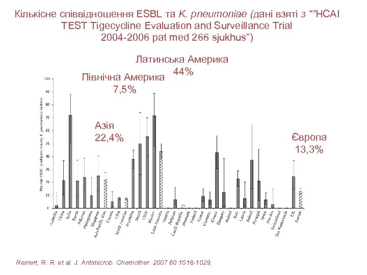 Кількісне співвідношення ESBL та K. pneumoniae (дані взяті з “”HCAI TEST Tigecycline Evaluation and Surveillance Trial 2004 -2006 pat med 266 sjukhus”) Латинська Америка 44% Північна Америка 7, 5% Азія 22, 4% Reinert, R. R. et al. J. Antimicrob. Chemother. 2007 60: 1018 -1029; Європа 13, 3%