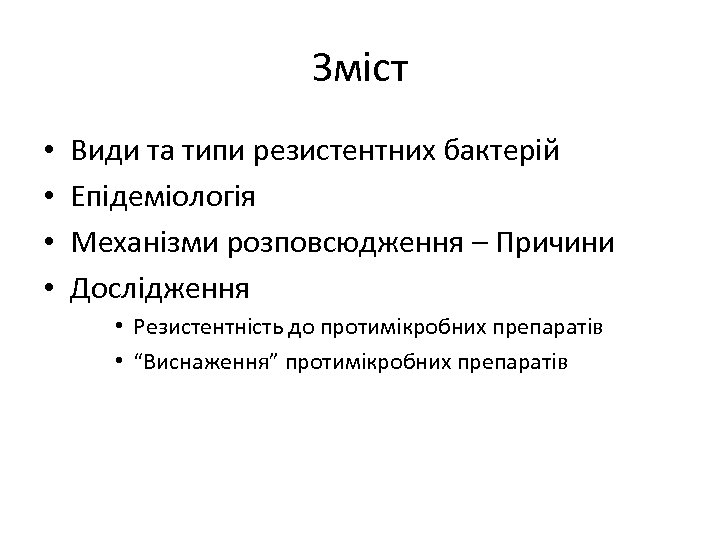 Зміст • • Види та типи резистентних бактерій Епідеміологія Механізми розповсюдження – Причини Дослідження • Резистентність до протимікробних препаратів • “Виснаження” протимікробних препаратів