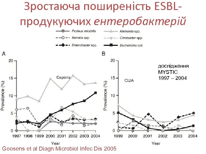 Зростаюча поширеність ESBLпродукуючих ентеробактерій Європа Goosens et al Diagn Microbiol Infec Dis 2005 США дослідження MYSTIC 1997 – 2004