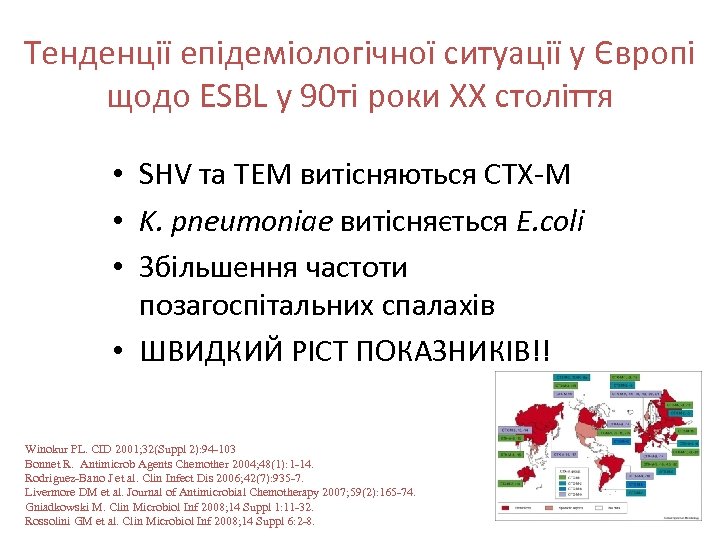 Тенденції епідеміологічної ситуації у Європі щодо ESBL у 90 ті роки ХХ століття • SHV та TEM витісняються CTX-M • K. pneumoniae витісняється E. coli • Збільшення частоти позагоспітальних спалахів • ШВИДКИЙ РІСТ ПОКАЗНИКІВ!! Winokur PL. CID 2001; 32(Suppl 2): 94 -103 Bonnet R. Antimicrob Agents Chemother 2004; 48(1): 1 -14. Rodriguez-Bano J et al. Clin Infect Dis 2006; 42(7): 935 -7. Livermore DM et al. Journal of Antimicrobial Chemotherapy 2007; 59(2): 165 -74. Gniadkowski M. Clin Microbiol Inf 2008; 14 Suppl 1: 11 -32. Rossolini GM et al. Clin Microbiol Inf 2008; 14 Suppl 6: 2 -8.