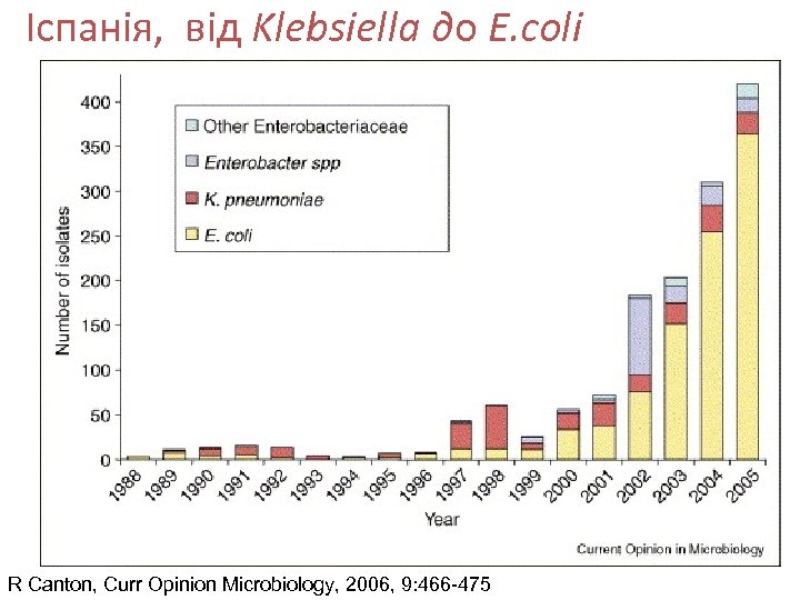 Іспанія, від Klebsiella дo E. coli R Canton, Curr Opinion Microbiology, 2006, 9: 466 -475