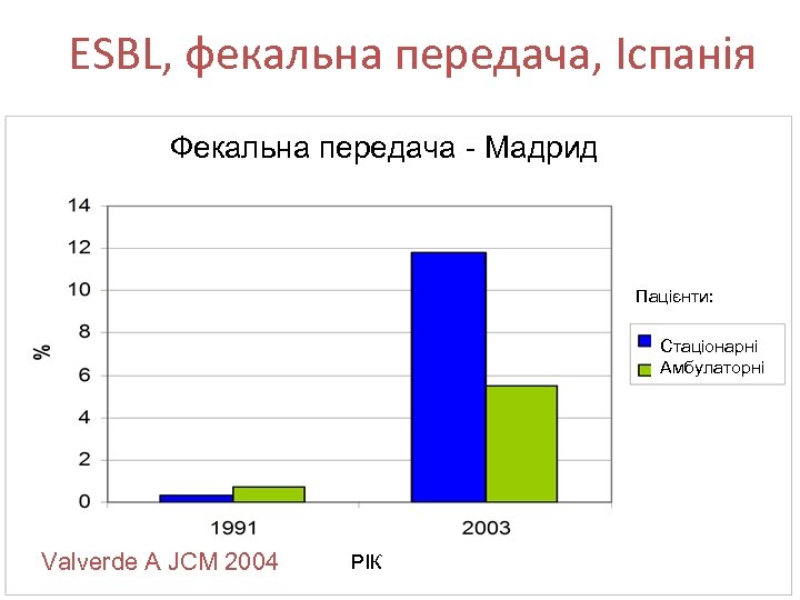 ESBL, фекальна передача, Іспанія Фекальна передача - Мадрид Пацієнти: Стаціонарні Амбулаторні Valverde A JCM 2004 РІК