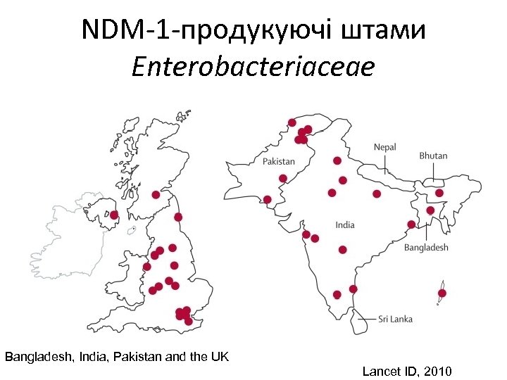 NDM-1 -продукуючі штами Enterobacteriaceae Bangladesh, India, Pakistan and the UK Lancet ID, 2010