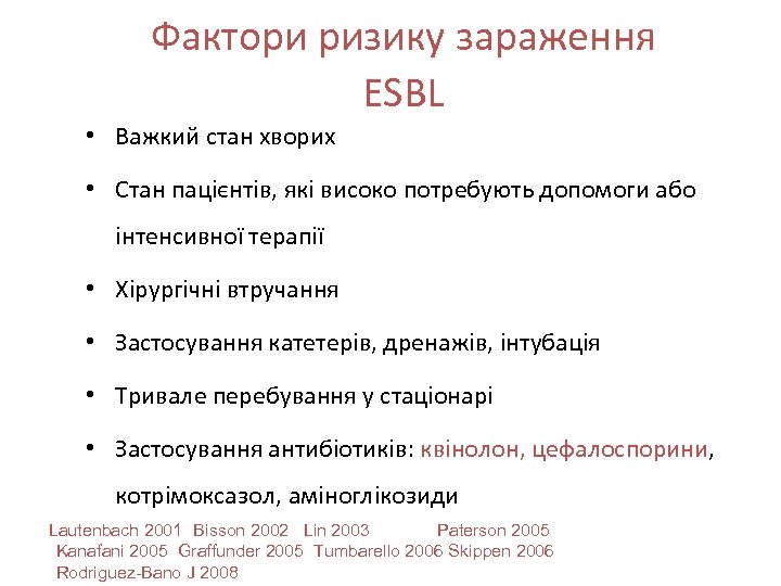 Фактори ризику зараження ESBL • Важкий стан хворих • Стан пацієнтів, які високо потребують допомоги або інтенсивної терапії • Хірургічні втручання • Застосування катетерів, дренажів, інтубація • Тривале перебування у стаціонарі • Застосування антибіотиків: квінолон, цефалоспорини, котрімоксазол, аміноглікозиди Lautenbach 2001 Bisson 2002 Lin 2003 Paterson 2005 Kanafani 2005 Graffunder 2005 Tumbarello 2006 Skippen 2006 Rodriguez-Bano J 2008