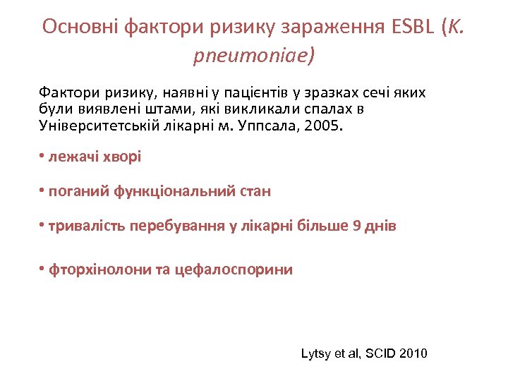 Основні фактори ризику зараження ESBL (K. pneumoniae) Фактори ризику, наявні у пацієнтів у зразках сечі яких були виявлені штами, які викликали спалах в Університетській лікарні м. Уппсала, 2005. • лежачі хворі • поганий функціональний стан • тривалість перебування у лікарні більше 9 днів • фторхінолони та цефалоспорини Lytsy et al, SCID 2010