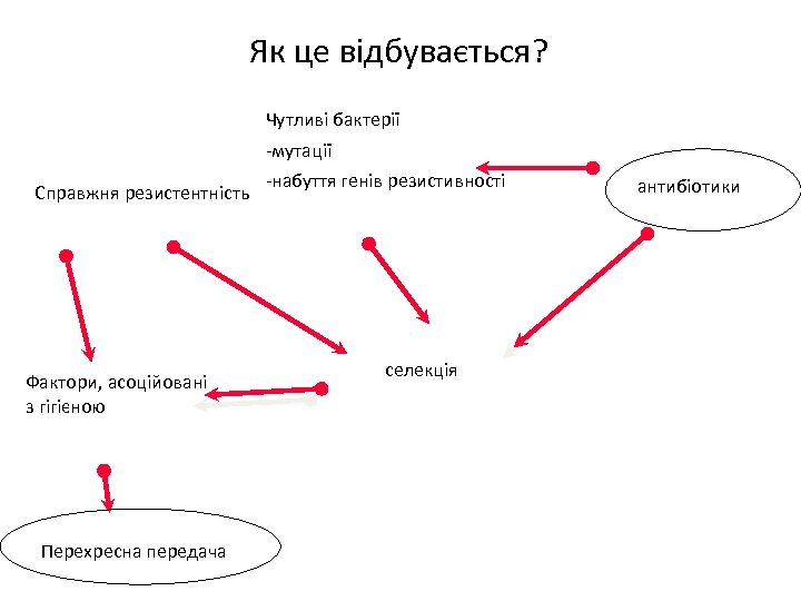 Як це відбувається? Чутливі бактерії -мутації Справжня резистентність Фактори, асоційовані з гігієною Перехресна передача -набуття генів резистивності селекція антибіотики