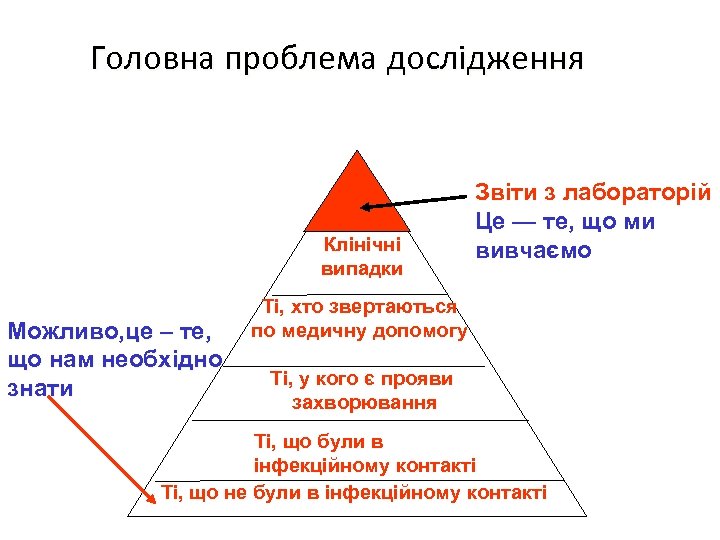 Головна проблема дослідження Клінічні випадки Можливо, це – те, що нам необхідно знати Звіти з лабораторій Це — те, що ми вивчаємо Ті, хто звертаються по медичну допомогу Ті, у кого є прояви захворювання Ті, що були в інфекційному контакті Ті, що не були в інфекційному контакті