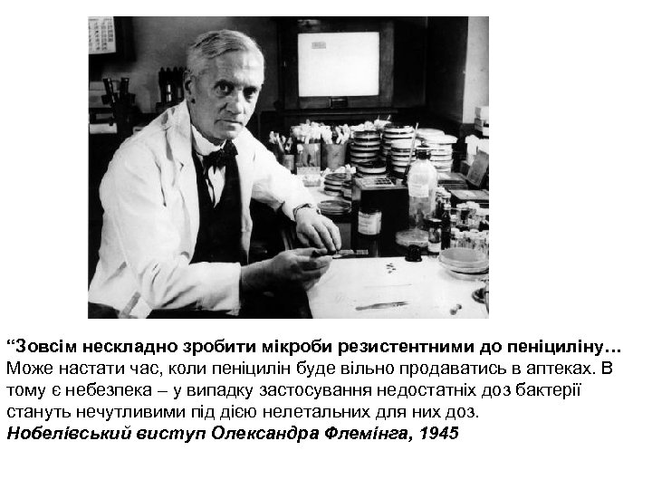 “Зовсім нескладно зробити мікроби резистентними до пеніциліну… Може настати час, коли пеніцилін буде вільно продаватись в аптеках. В тому є небезпека – у випадку застосування недостатніх доз бактерії стануть нечутливими під дією нелетальних для них доз. Нобелівський виступ Олександра Флемінга, 1945