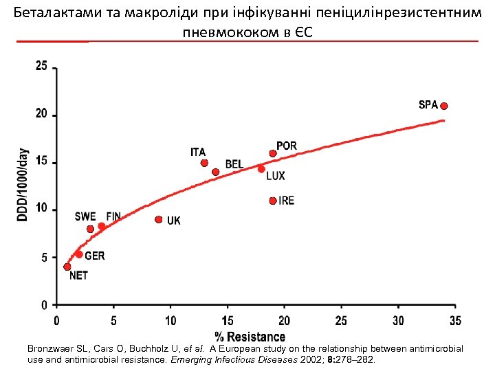 Беталактами та макроліди при інфікуванні пеніцилінрезистентним пневмококом в ЄС Bronzwaer SL, Cars O, Buchholz U, et al. A European study on the relationship between antimicrobial use and antimicrobial resistance. Emerging Infectious Diseases 2002; 8: 278– 282.