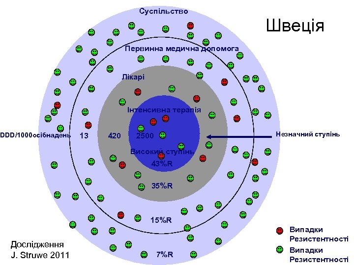 Суспільство Швеція Первинна медична допомога Лікарі Інтенсивна терапія DDD/1000 осібнадень 13 420 Незначний ступінь 2500 Високий ступінь 43%R 35%R 15%R Дослідження J. Struwe 2011 7%R Випадки Резистентності