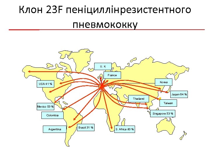 Клон 23 F пеніциллінрезистентного пневмококку U. K France USA 41 % Korea Japan 64 % Thailand Taiwan Mexico 53 % Singapore 53 % Colombia Argentina Brazil 31 % S. Africa 80 %