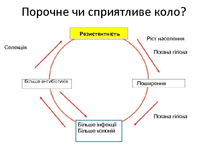 Порочне чи сприятливе коло? Резистентність Селекція Ріст населення Погана гігієна Більше антибіотиків Поширення Погана гігієна Більше інфекції Більше колоній