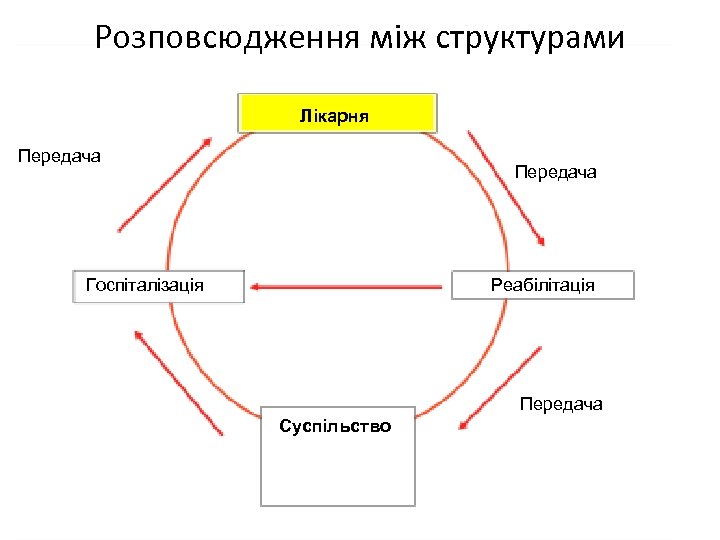 Розповсюдження між структурами Лікарня Передача Госпіталізація Реабілітація Передача Суспільство