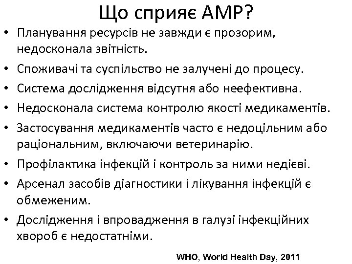 Що сприяє АМР? • Планування ресурсів не завжди є прозорим, недосконала звітність. • Споживачі та суспільство не залучені до процесу. • Система дослідження відсутня або неефективна. • Недосконала система контролю якості медикаментів. • Застосування медикаментів часто є недоцільним або раціональним, включаючи ветеринарію. • Профілактика інфекцій і контроль за ними недієві. • Арсенал засобів діагностики і лікування інфекцій є обмеженим. • Дослідження і впровадження в галузі інфекційних хвороб є недостатніми. WHO, World Health Day, 2011