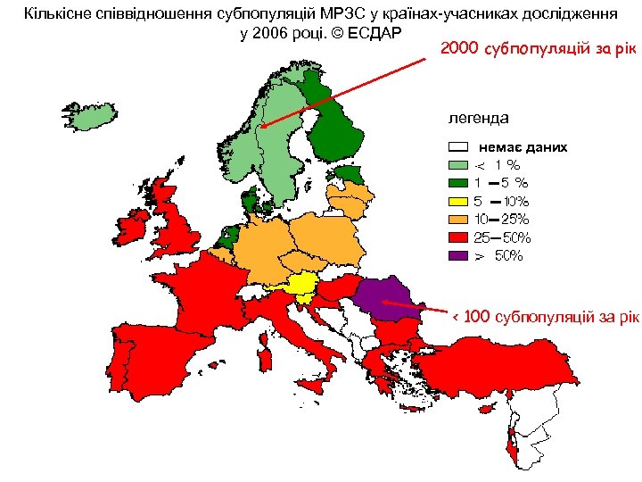 Кількісне співвідношення субпопуляцій МРЗС у країнах-учасниках дослідження у 2006 році. © ЕСДАР 2000 субпопуляцій за рік легенда немає даних < 100 субпопуляцій за рік