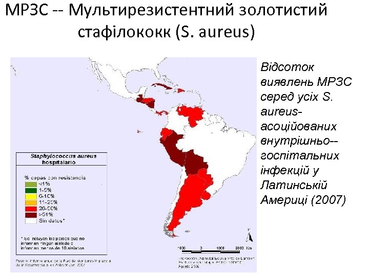 МРЗС -- Мультирезистентний золотистий стафілококк (S. aureus) Відсоток виявлень МРЗС серед усіх S. aureusасоційованих внутрішньо-госпітальних інфекцій у Латинській Америці (2007)