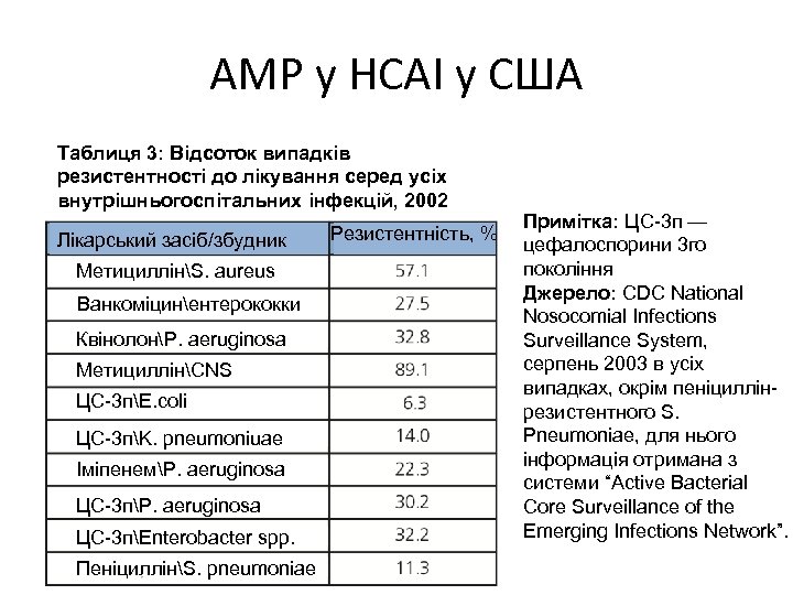 АМР у HCAI у США Таблиця 3: Відсоток випадків резистентності до лікування серед усіх внутрішньогоспітальних інфекцій, 2002 Лікарський засіб/збудник МетициллінS. aureus Ванкоміцинентерококки КвінолонP. aeruginosa МетициллінCNS ЦС-3 пE. coli ЦС-3 пK. pneumoniuae ІміпенемP. aeruginosa ЦС-3 пEnterobacter spp. ПеніциллінS. pneumoniae Резистентність, % Примітка: ЦС-3 п — цефалоспорини 3 го покоління Джерело: CDC National Nosocomial Infections Surveillance System, серпень 2003 в усіх випадках, окрім пеніциллінрезистентного S. Pneumoniae, для нього інформація отримана з системи “Active Bacterial Core Surveillance of the Emerging Infections Network”.