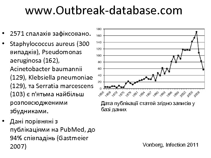 www. Outbreak-database. com • 2571 спалахів зафіксовано. • Staphylococcus aureus (300 випадків), Pseudomonas aeruginosa (162), Acinetobacter baumannii (129), Klebsiella pneumoniae (129), та Serratia marcescens (103) є п'ятьма найбільш розповсюдженими збудниками. • Дані порівняні з публікаціями на Pub. Med, до 94% співпадінь (Gastmeier 2007) Дата публікації статей згідно записів у базі даних Vonberg, Infection 2011