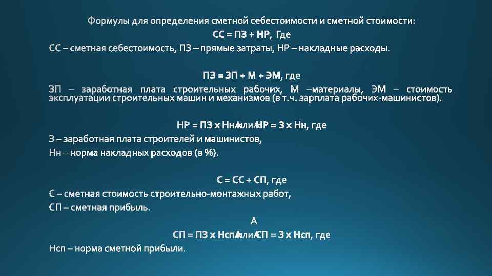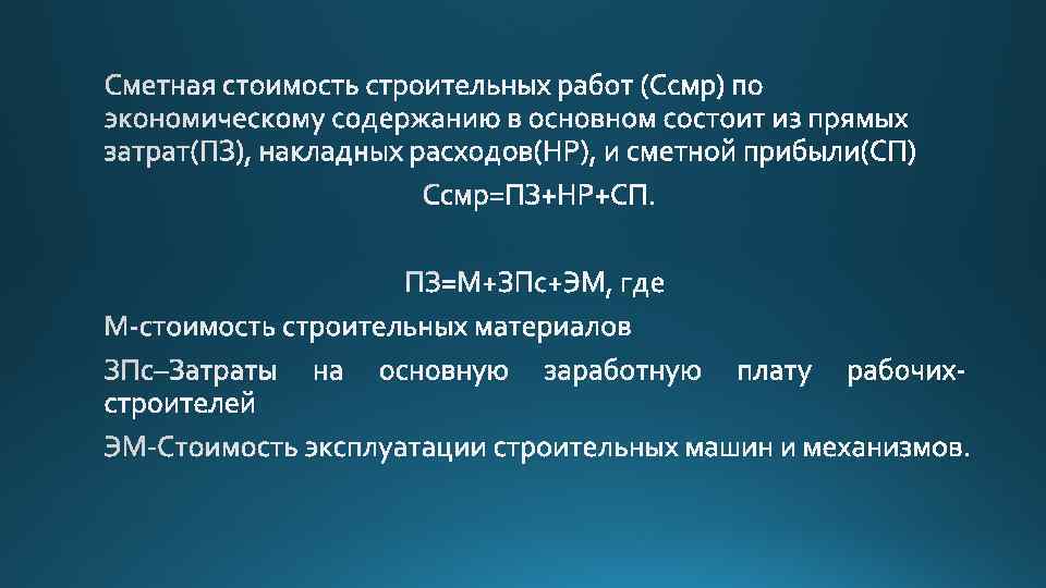 Прямы затраты Часть общей стоимости по смете, включающая расчетные затраты на оплату труда рабочих с налогами, стоимость строительных материалов, изделий и конструкций, стоимость работы строительные машины, оборудования и инструмента, логистические затраты по доставке материальных ресурсов на стройки Косвенные затраты Часть общей стоимости по смете, включающая расчетные затраты на управление и организацию строительного процесса, содержание аппарата управления подрядных организаций, с сопутствующими затратами Сметная прибыль Часть общей стоимости по смете, включающая расчетные (общественнонеобходимые) или договорные затраты на расширенное воспроизводство подрядных организаций строительной отрасли