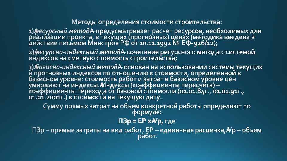 Сметная стоимость Результаты сметного расчета, устанавливающие потребность в финансовых ресурсах (денежных средств) на выполнение отдельных строительных работ, этапов и строительство объекта в целом Базисная сметная стоимость Общая стоимость строительства по смете, рассчитанная на основе сметных расценок и нормативов на строительные работы и услуги, утвержденных на прошлую, базисную дату Базовая сметная Общая стоимость строительства по смете, рассчитанная любым методом в ценах на стоимость строительные работы, ресурсы и услуги, сложившихся на дату разработки или утверждения заказчиком сметной документации Текущая сметная стоимость Общая стоимость строительства по смете, рассчитанная любым методом в ценах на строительные работы, ресурсы и услуги, сложившихся на региональных рынках в любой (текущий) момент времени