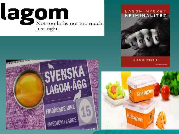 LAGOM ÄR BÄST Один из стереотипов о шведском характере, считается эмблемой шведскости. Швецию называют Lagomlandet – страна Lagom – это не слишком много и не слишком мало. Золотая середина. Отражает стремление шведов избегать крайностей, быть сдержанными.