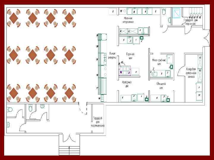 • • • • В предприятиях с самообслуживанием при большом потоке посетителей на площади обеденного зала рекомендуется предусматривать установку транспортера для доставки использованной посуды из зала в моечное помещение столовой посуды. В предприятиях самообслуживания внутренние буфеты, формируемые на площади обеденного зала и включающие два помещения: для отпуска продукции и подсобное – для хранения продукции. Первое помещение выходит в зал и оборудуется буфетным прилавком; охлаждаемыми витринами; второе – холодильными шкафами, льдогенераторами, стеллажами и подтоварниками. При этом пути загрузки буфетов товарами не должны пересекаться с путями следования посетителей. Раздаточные зоны и буфеты при предприятиях с обслуживанием официантами размещаются на площадях групп производственных помещений (см. раздел производственные помещения). Обеденные залы, как правило, рекомендуется располагать в одном уровне с основной группой производственных помещений: горячим и холодным цехами, моечными посуды, буфетами и раздаточными. В общедоступных предприятиях общественного питания количество мест в гардеробе для верхней одежды посетителей должно соответствовать вместимости зала с коэффициентом К– 1, 1, учитывающим задержку посетителей в зале, а также тех, которые в данный момент находятся в вестибюле, на лестницах и т. п. Общую длину вешалок следует определять из расчета 6 крючков для одежды на 1 м вешалки. Входы в уборные для посетителей предусматриваются из вестибюля. В общедоступных предприятиях до 300 мест количество унитазов в уборных для посетителей принимается из расчета 1 унитаз на каждые 60 мест, свыше 300 – дополнительно 1 унитаз на каждые 100 мест. В предприятиях менее 50 мест допускается проектировать две уборных (для мужчин и женщин). В мужских уборных на каждый унитаз предусматривается 1 писсуар (в уборных пивных баров – 2 писсуара). В шлюзах уборных предусматривается 1 умывальник на каждые 4 унитаза, но не менее одного. В вестибюлях или в отдельных помещениях предусматривается для посетителей дополнительно по одному умывальнику на каждые 50 мест. В закусочных без вестибюлей умывальники допускается устанавливать в зале. В ресторанах и кафе с обслуживанием официантами в шлюзах уборных предусматривается дополнительная площадь не менее 4 м 2 для туалетной. В предприятиях общественного питания, располагаемых в зонах массового туризма, на автотрассах и в других местах со значительным одновременным потоком посетителей, рекомендуется удваивать количество санитарных приборов, а площадь вестибюля при этом увеличивать до 30% против установленной настоящими правилами. • Помещения для приема и хранения продуктов • Помещения для приема (загрузочную) и хранения продуктов (кладовые охлаждаемые и неохлаждаемые) необходимо проектировать единым блоком – функциональной зоной, имеющей непосредственную связь с грузовыми лифтами и связь с другими помещениями через производственные коридоры. В предприятиях с количеством мест 500 и более перед помещением загрузочной (приема продуктов) следует проектировать платформу высотой 1, 1 – 1, 2 м, шириной 3 м и длиной по расчету, но не менее 3 м (для разгрузки одного автомобиля), оборудованную при необходимости стационарными или передвижными устройствами, уравнивающими пол платформы с полом 