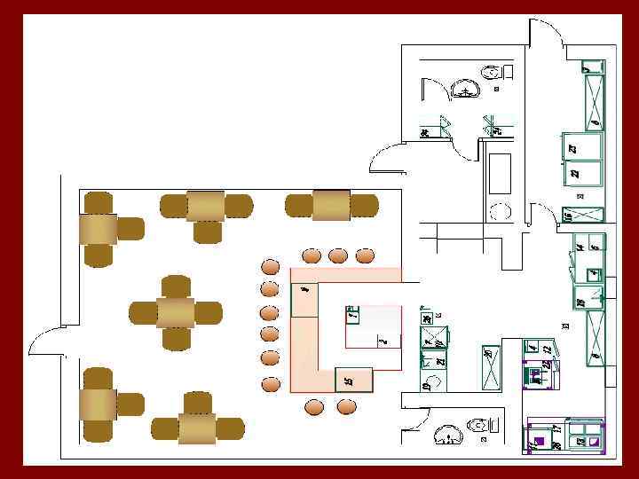 • • • При проектировании и реконструкции общедоступных предприятий общественного питания необходимо учитывать также интересы социально незащищенных групп населения (инвалидов). В этой связи рекомендуется учитывать при проектировании следующие позиции: при входах в здания общественного питания, вместимостью от 100 мест лестницы дублировать пандусом с шероховатой поверхностью, шириной не менее 1, 2 м для доступа посетителей в инвалидных колясках, при этом ширина полотна двери должна быть не менее 0, 9 м; в этих типах предприятий питания рекомендуется отводить до 10 мест для инвалидов на колясках, при этом выделенная зона в зале должна иметь удобный доступ к раздаточной и по планировочным решениям и площадям обеспечивать разворот коляски с диаметром окружности 1, 5 м, т. е. не менее 3 м 2 на одно место во всех магазинах кулинарии, размещаемых при предприятиях общественного питания на первых этажах, предусматривать организацию выдачи обедов на дом; при проектировании предприятий питания, специально предназначенных для обслуживания инвалидов, необходимо во всех типах предприятий предусматривать обслуживание только через официантов и размещать обеденные залы, исходя из норматива площади не менее 3 м 2 на место, только на первых этажах (при отсутствии пассажирских лифтов); Проектирование уборных для инвалидов в таких предприятиях должно учитывать следующие специфические требования; площадь кабины должна рассчитываться исходя из размера инвалидной коляски со свободным подходом с трех сторон к унитазу (для сопровождающего человека); кабины необходимо оборудовать специальными откидывающимися поручнями около унитаза и жестко укрепленными на стенах кабины, также крючками для одежды и костылей.