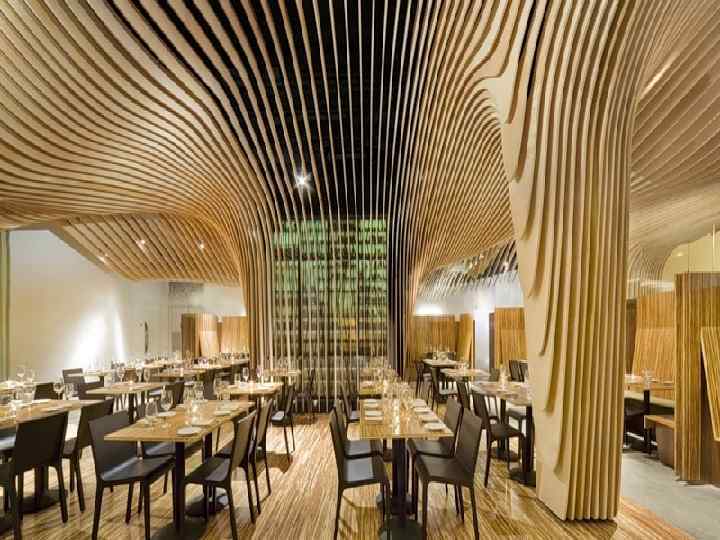 Особенности конструктивного решения • Следующий ресторан имеет чрезвычайно необычный дизайн, каждый посетитель будет помнить это заведение, дизайн, интерьер помещения и, конечно, рассказать о нем свом знакомым. Стены и потолки этого удивительного ресторана украшены с помощью элемента волны из березовой фанеры, придерживаясь оригинальной мысли дизайнера, которая сравнивается с определенной загадкой. Мебель и потолок в сговоре с целью создания общего эффекта.