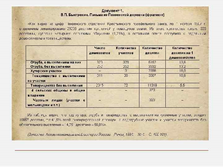 Документ 1 «Дикая, полуголодная деревня, не привыкшая уважать ни свою, ни чужую собственность, не боявшаяся, действуя миром, никакой ответственности, всегда будет представлять горючий материал, готовый вспыхнуть по каждому поводу» .
