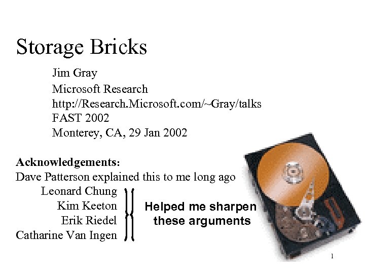Storage Bricks Jim Gray Microsoft Research http: //Research. Microsoft. com/~Gray/talks FAST 2002 Monterey, CA, 29 Jan 2002 Acknowledgements: Dave Patterson explained this to me long ago Leonard Chung Kim Keeton Helped me sharpen Erik Riedel these arguments Catharine Van Ingen 1