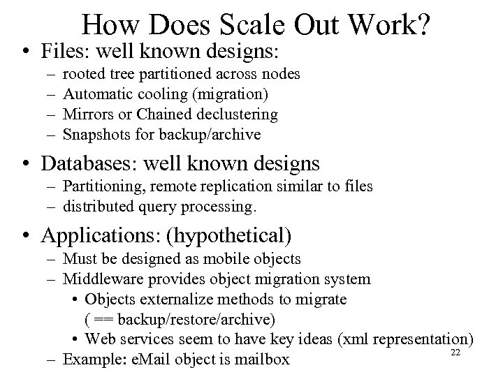 How Does Scale Out Work? • Files: well known designs: – – rooted tree partitioned across nodes Automatic cooling (migration) Mirrors or Chained declustering Snapshots for backup/archive • Databases: well known designs – Partitioning, remote replication similar to files – distributed query processing. • Applications: (hypothetical) – Must be designed as mobile objects – Middleware provides object migration system • Objects externalize methods to migrate ( == backup/restore/archive) • Web services seem to have key ideas (xml representation) 22 – Example: e. Mail object is mailbox